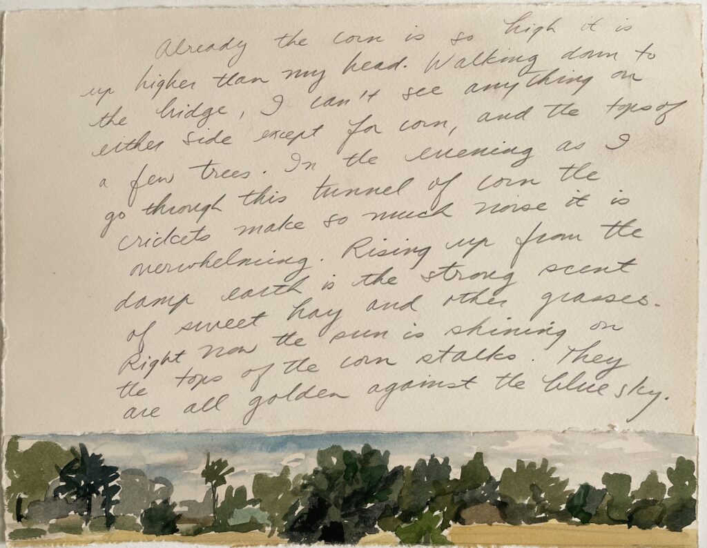 Walking down to the bridge, I can’t see anything on either side except for corn, and the tops of a few trees, In the evening as I go through this tunnel of corn the crickets make so much noise it is overwhelming.