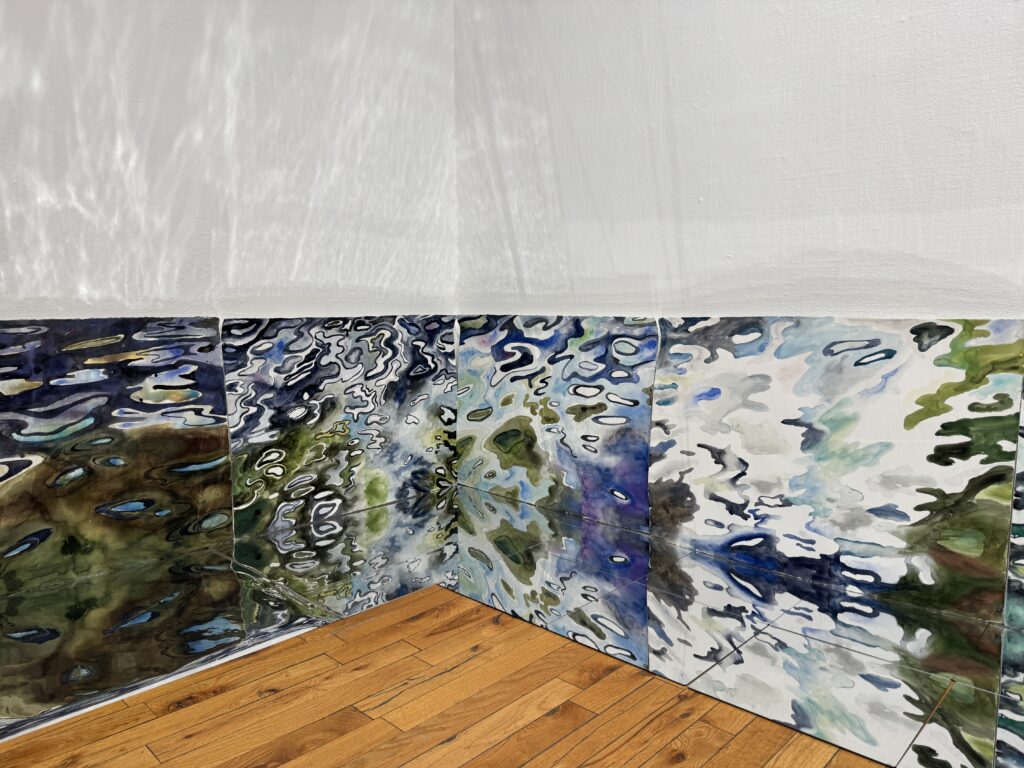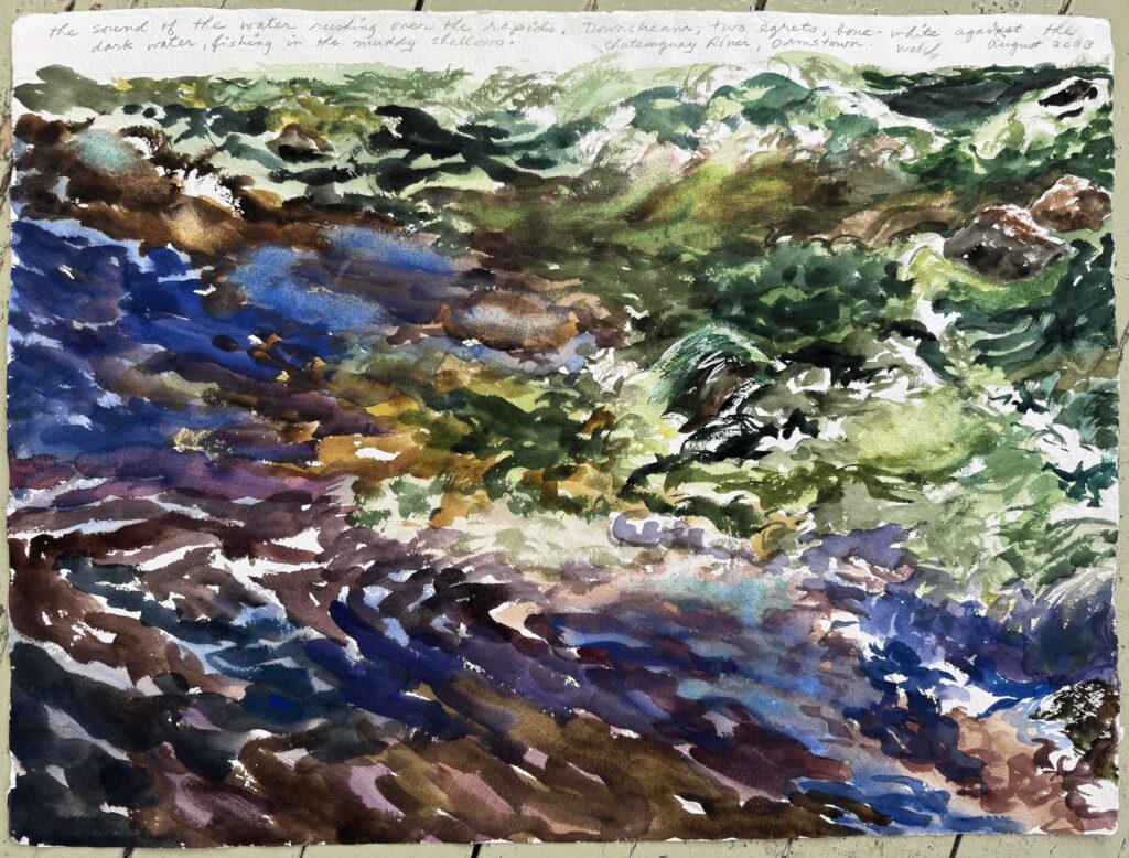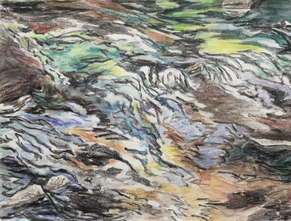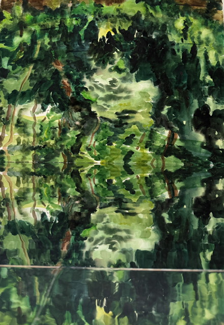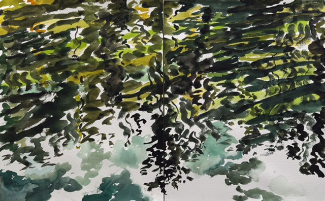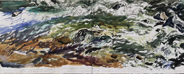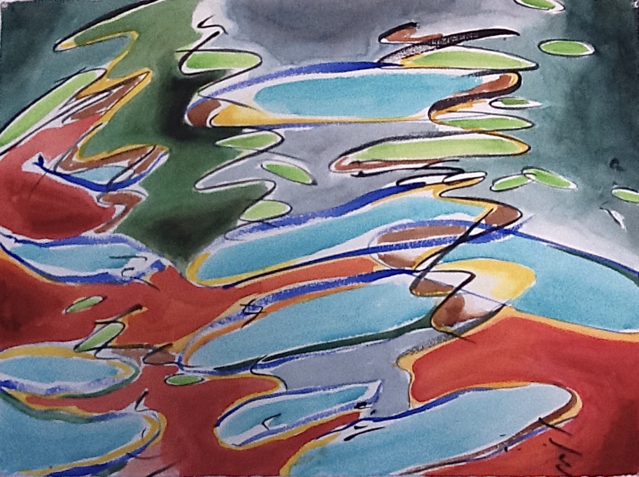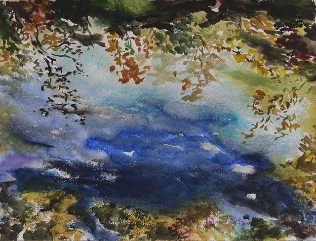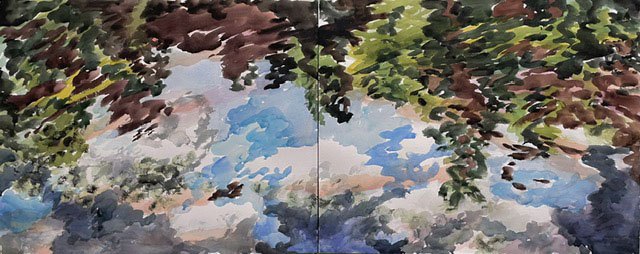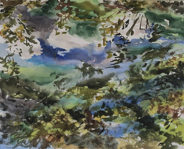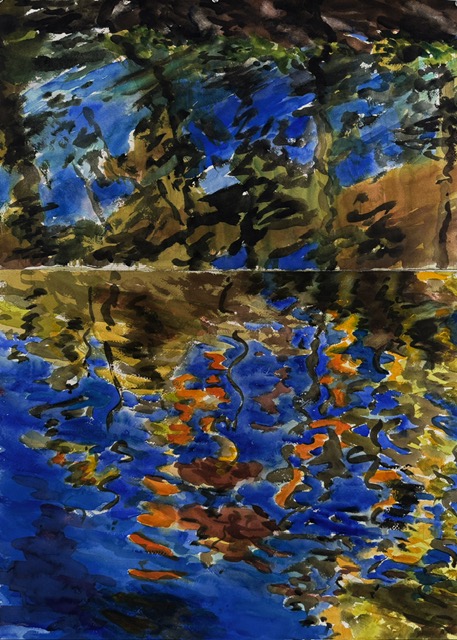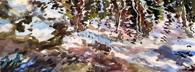 This body of work was done in various locations over a period of several years. The challenge of working on-site helps stimulate both a connection with the subject and an awareness of its energy and vibrancy. In each painting I attempt to transmit a feeling of the primal forces at work within the essential element of water. Water has the power to both nourish and destroy; to change or demolish a landscape. As the 5th century BCE Taoist philosopher Lao Tzu wrote, ‘‘What is softer, more fluid, than water? But water will wear away rock, which is rigid and cannot yield…what is soft is strong.’’ Water is affected by many forces, including the season, weather conditions, temperature, and time of day. It is constantly shifting and changing. Therefore every stroke of watercolour is capturing only one particular moment, and changes in humidity, light level, time of day, etc. will change what is happening with the subject. Each colour, shape, movement, reflection or ripple is only visible for an instant. The painting then becomes a record of a constantly shifting reality rather than a snapshot of a fixed time and place. Moreover, because of its mutable and transient nature, the subject of water can itself become a canvas upon which the artist can transmit emotional, psychological or philosophical states. Water then becomes a metaphor for the fragile nature of our existence.