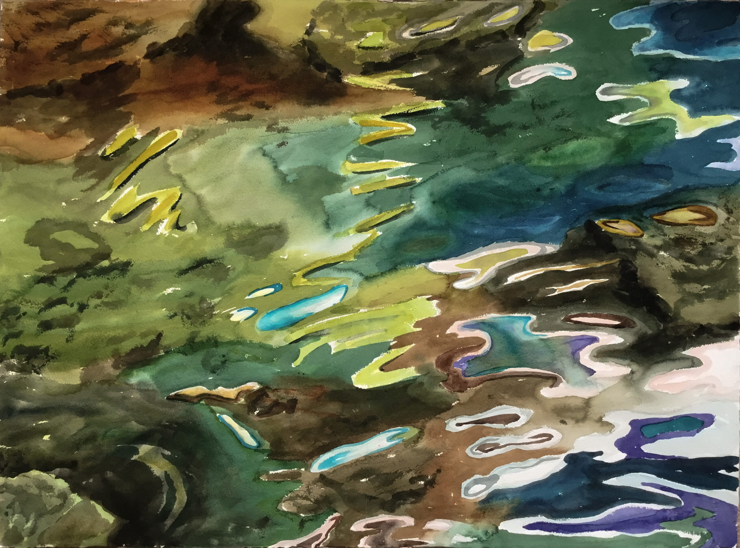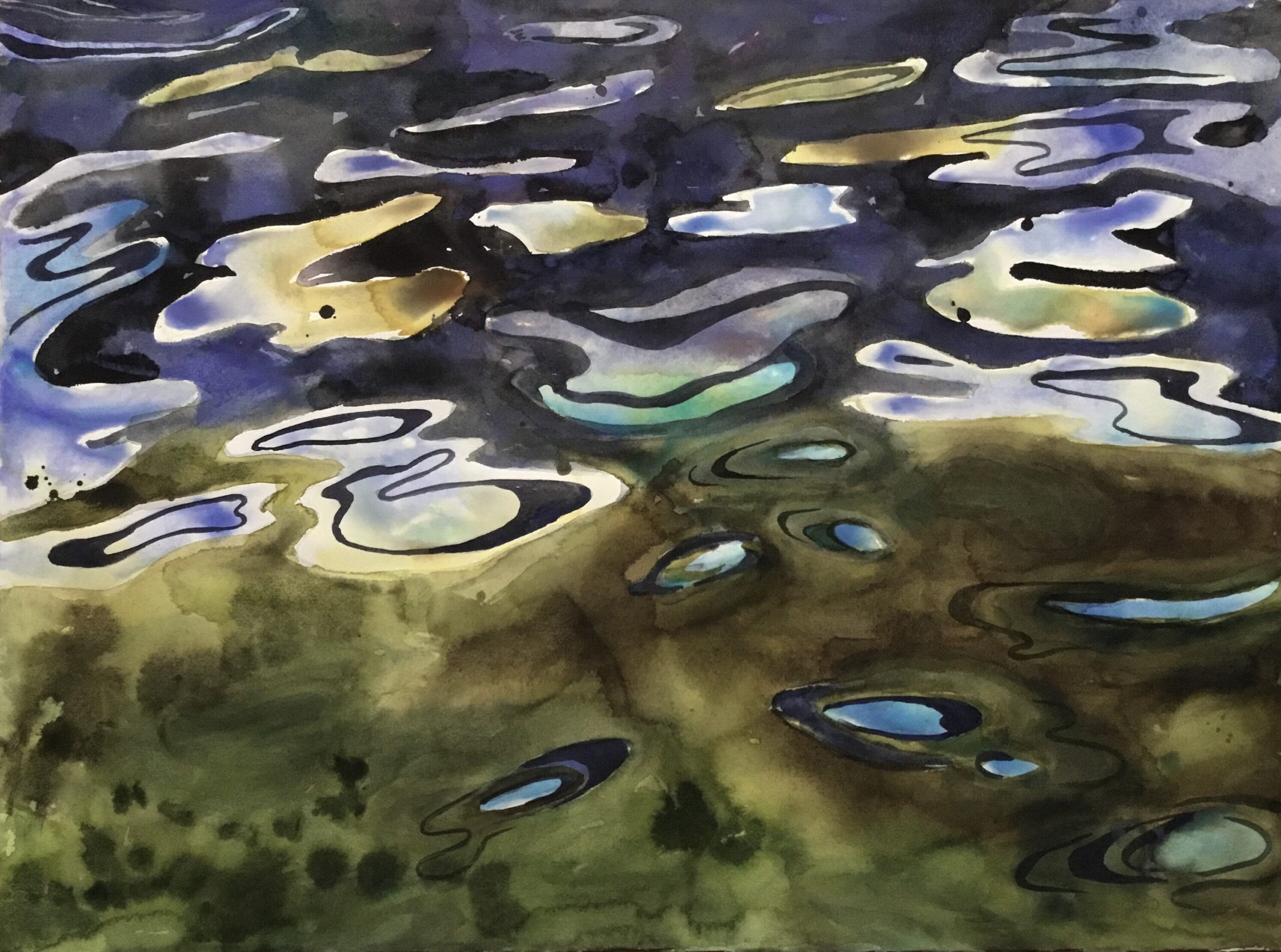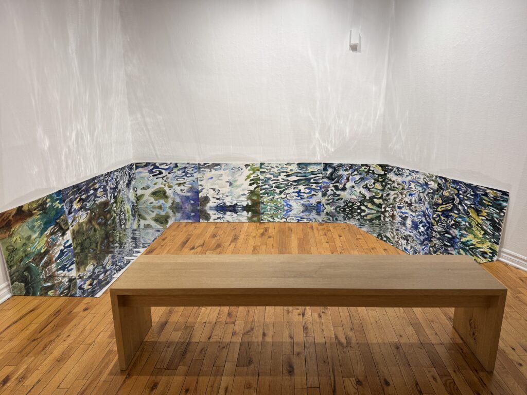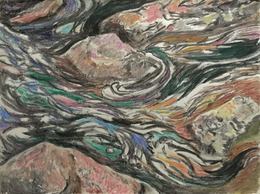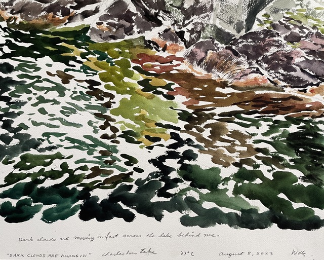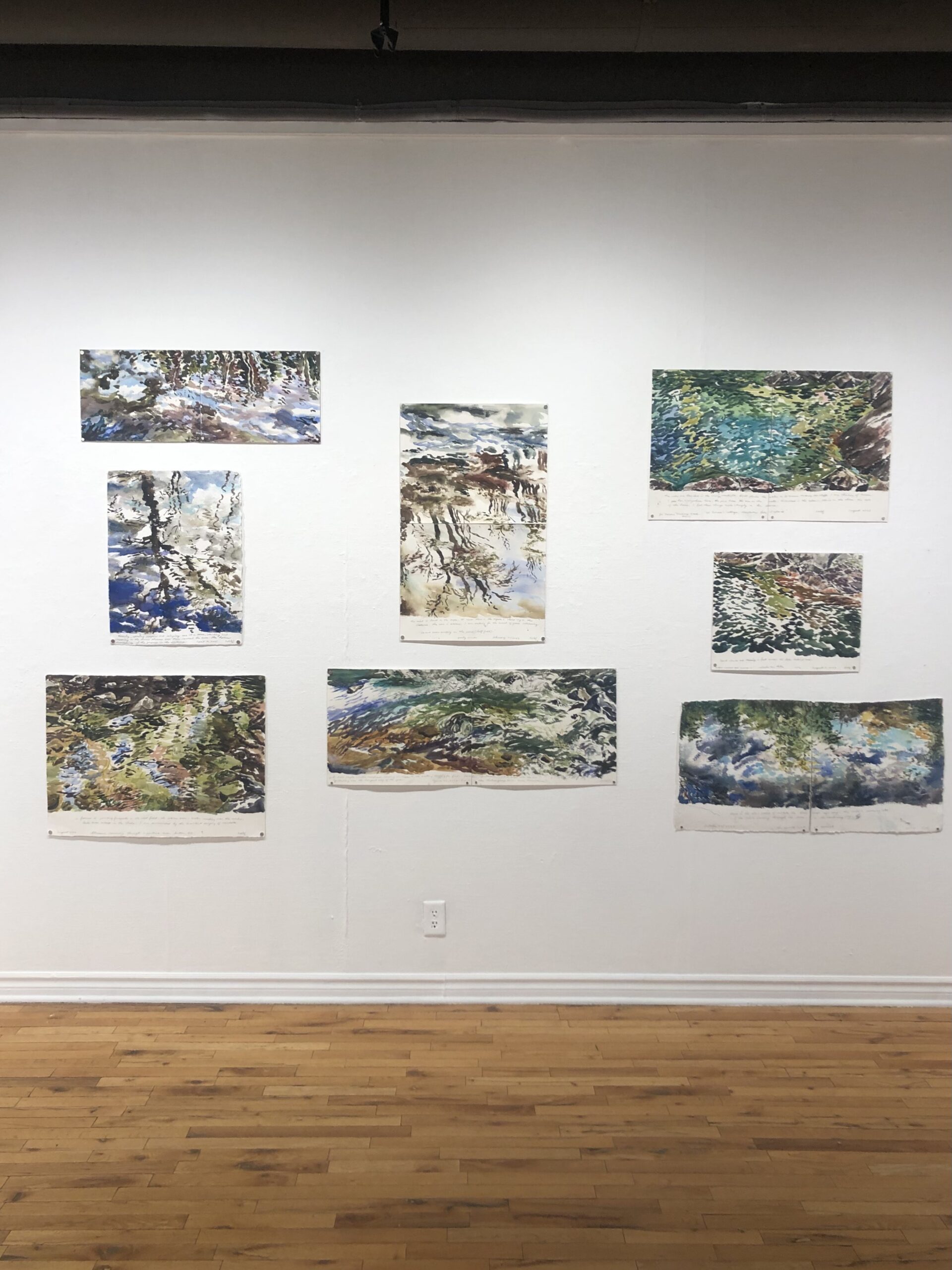 This body of work was done in various locations over a period of several years. The challenge of working on-site helps stimulate both a connection with the subject and an awareness of its energy and vibrancy. In each painting I attempt to transmit a feeling of the primal forces at work within the essential element of water. Water has the power to both nourish and destroy; to change or demolish a landscape. As the 5th century BCE Taoist philosopher Lao Tzu wrote, ‘‘What is softer, more fluid, than water? But water will wear away rock, which is rigid and cannot yield…what is soft is strong.’’ Water is affected by many forces, including the season, weather conditions, temperature, and time of day. It is constantly shifting and changing. Therefore every stroke of watercolour is capturing only one particular moment, and changes in humidity, light level, time of day, etc. will change what is happening with the subject. Each colour, shape, movement, reflection or ripple is only visible for an instant. The painting then becomes a record of a constantly shifting reality rather than a snapshot of a fixed time and place. Moreover, because of its mutable and transient nature, the subject of water can itself become a canvas upon which the artist can transmit emotional, psychological or philosophical states. Water then becomes a metaphor for the fragile nature of our existence.
