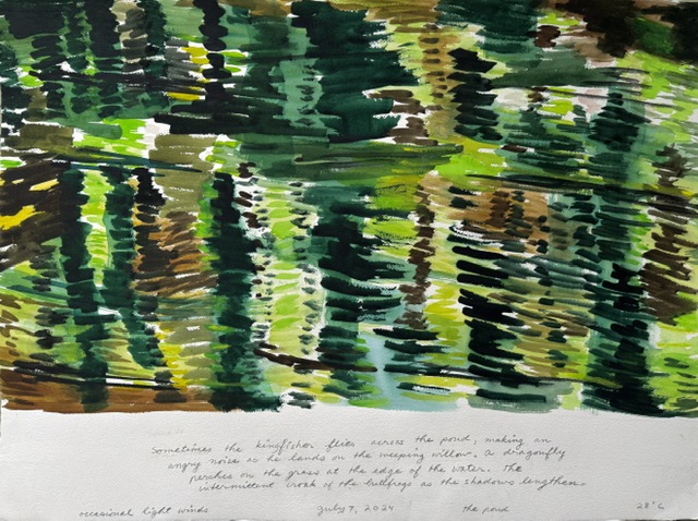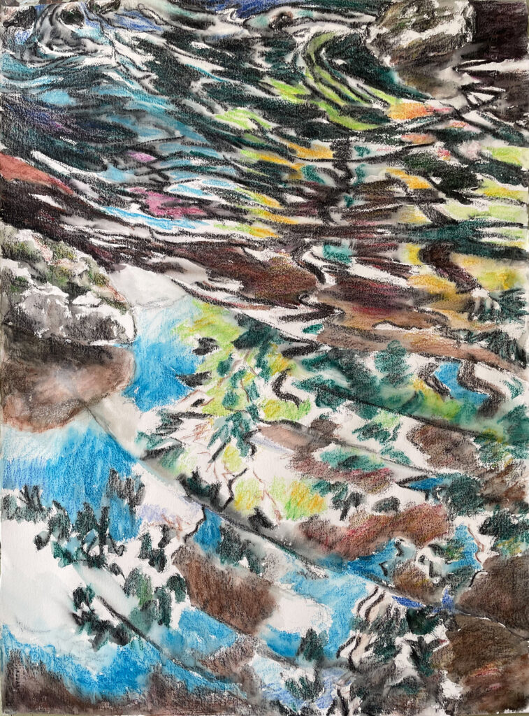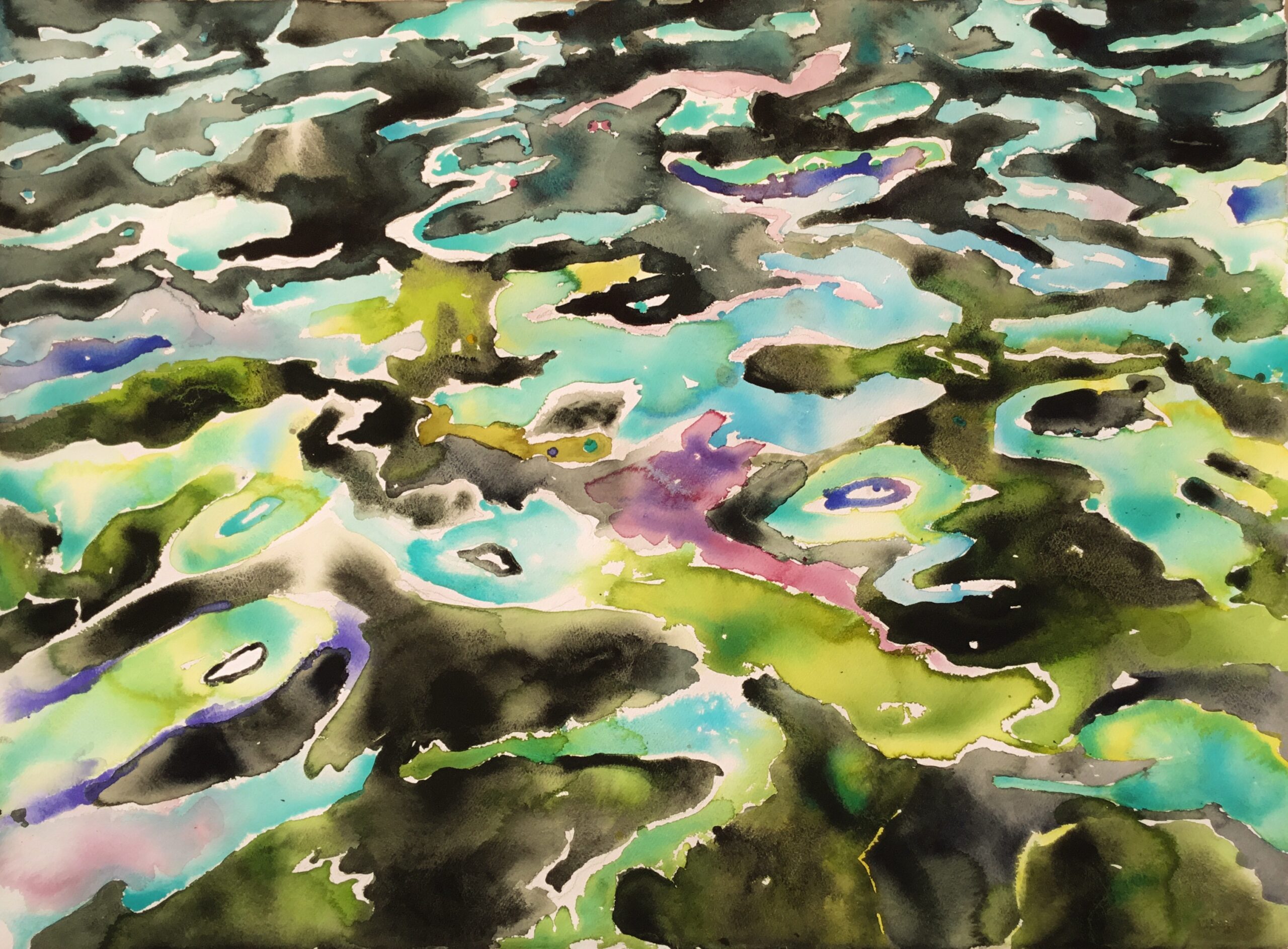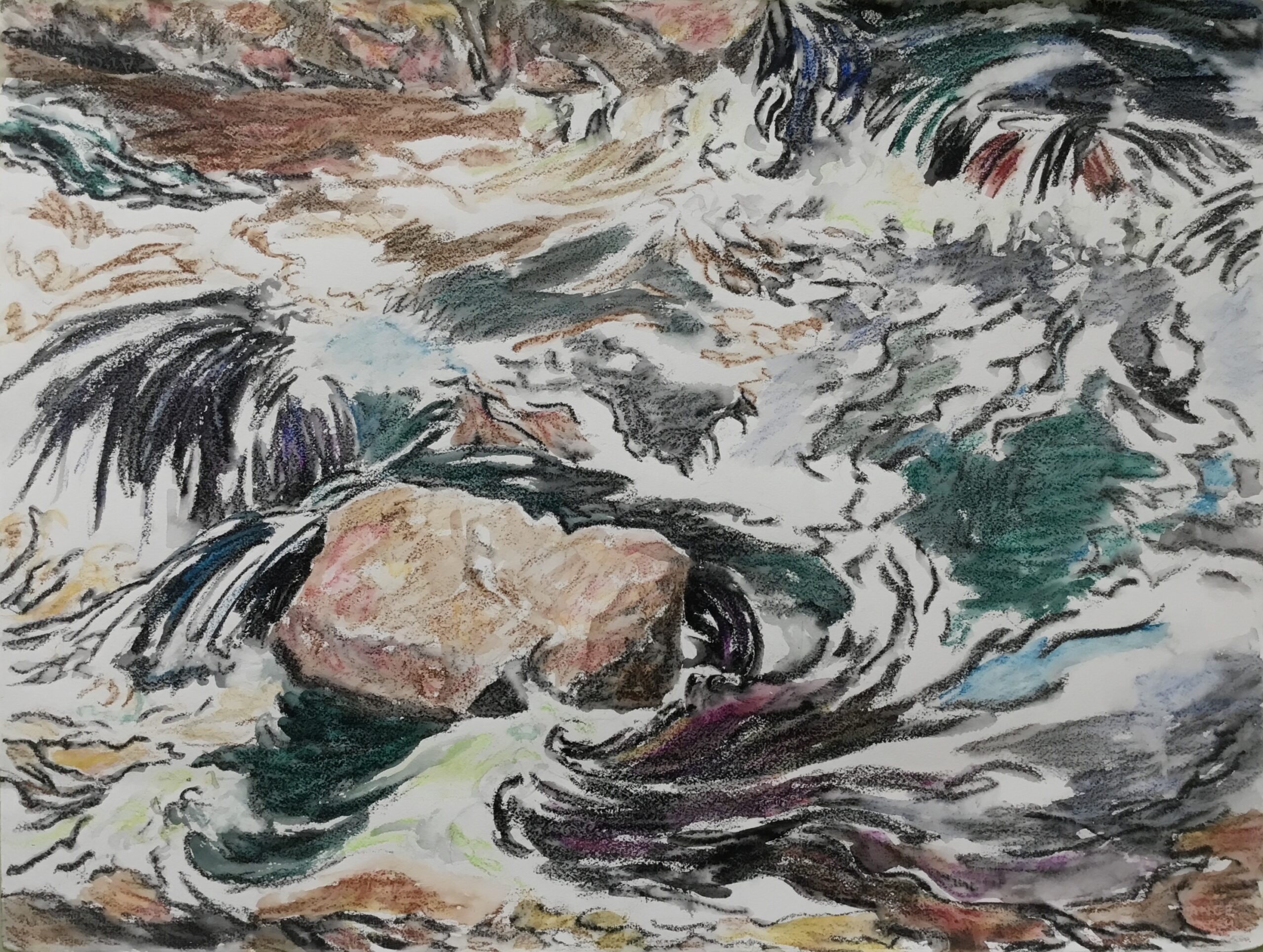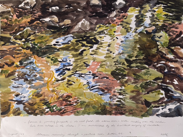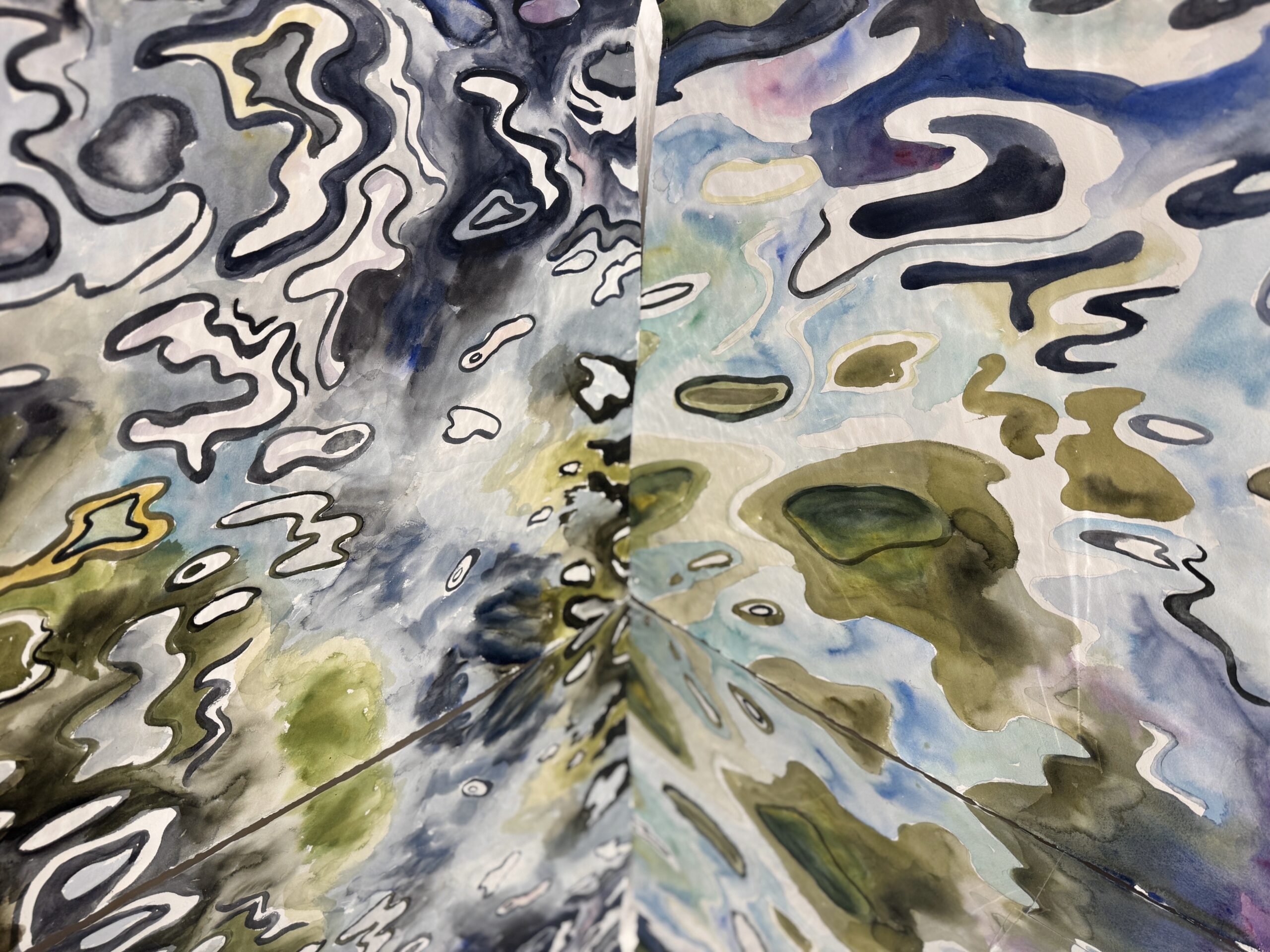 This body of work was done in various locations over a period of several years. The challenge of working on-site helps stimulate both a connection with the subject and an awareness of its energy and vibrancy. In each painting I attempt to transmit a feeling of the primal forces at work within the essential element of water. Water has the power to both nourish and destroy; to change or demolish a landscape. As the 5th century BCE Taoist philosopher Lao Tzu wrote, ‘‘What is softer, more fluid, than water? But water will wear away rock, which is rigid and cannot yield…what is soft is strong.’’ Water is affected by many forces, including the season, weather conditions, temperature, and time of day. It is constantly shifting and changing. Therefore every stroke of watercolour is capturing only one particular moment, and changes in humidity, light level, time of day, etc. will change what is happening with the subject. Each colour, shape, movement, reflection or ripple is only visible for an instant. The painting then becomes a record of a constantly shifting reality rather than a snapshot of a fixed time and place. Moreover, because of its mutable and transient nature, the subject of water can itself become a canvas upon which the artist can transmit emotional, psychological or philosophical states. Water then becomes a metaphor for the fragile nature of our existence.