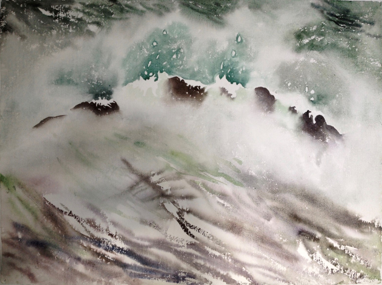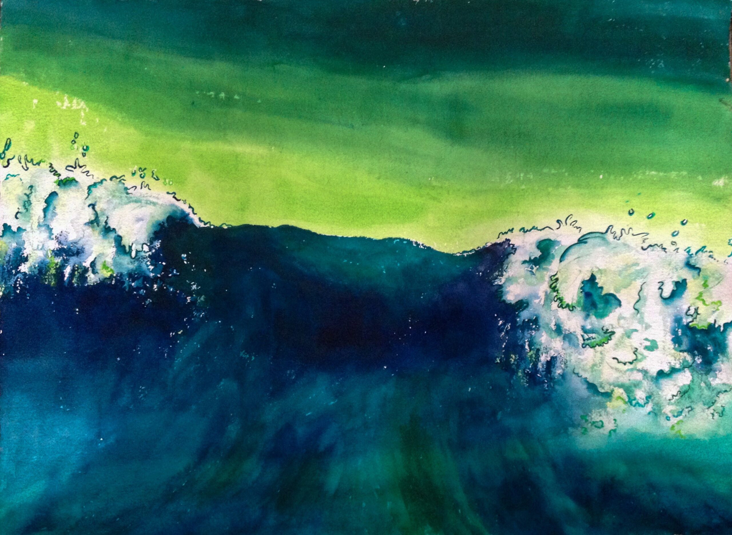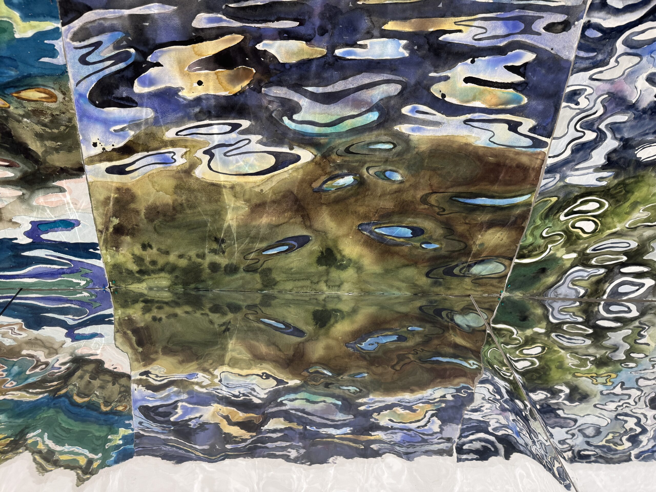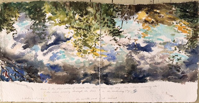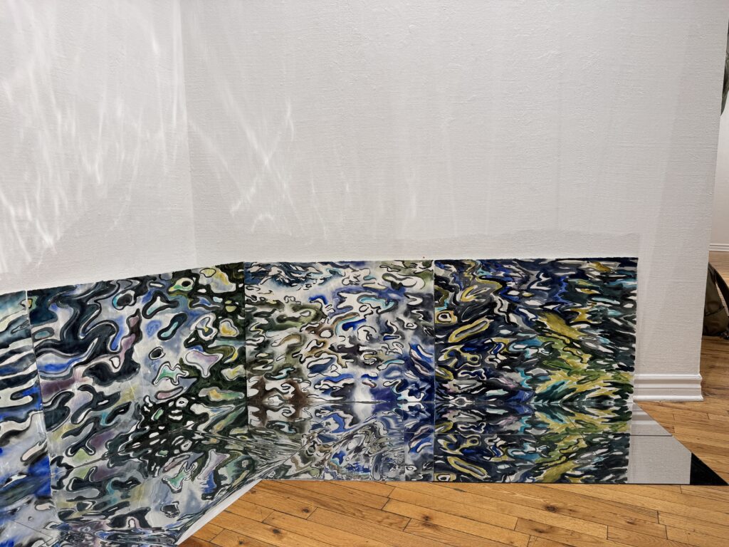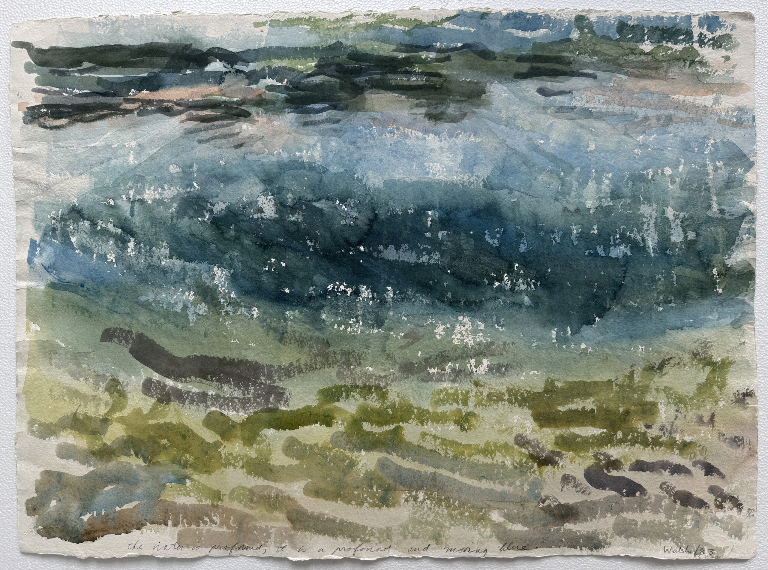 This body of work was done in various locations over a period of several years. The challenge of working on-site helps stimulate both a connection with the subject and an awareness of its energy and vibrancy. In each painting I attempt to transmit a feeling of the primal forces at work within the essential element of water. Water has the power to both nourish and destroy; to change or demolish a landscape. As the 5th century BCE Taoist philosopher Lao Tzu wrote, ‘‘What is softer, more fluid, than water? But water will wear away rock, which is rigid and cannot yield…what is soft is strong.’’ Water is affected by many forces, including the season, weather conditions, temperature, and time of day. It is constantly shifting and changing. Therefore every stroke of watercolour is capturing only one particular moment, and changes in humidity, light level, time of day, etc. will change what is happening with the subject. Each colour, shape, movement, reflection or ripple is only visible for an instant. The painting then becomes a record of a constantly shifting reality rather than a snapshot of a fixed time and place. Moreover, because of its mutable and transient nature, the subject of water can itself become a canvas upon which the artist can transmit emotional, psychological or philosophical states. Water then becomes a metaphor for the fragile nature of our existence.
