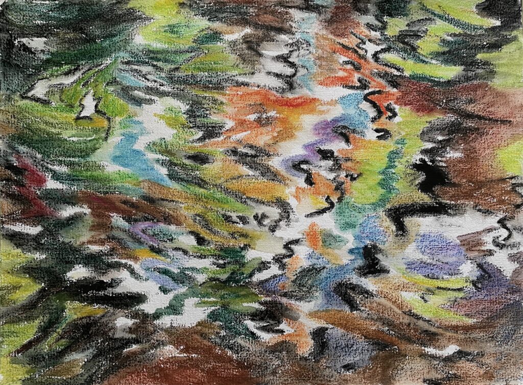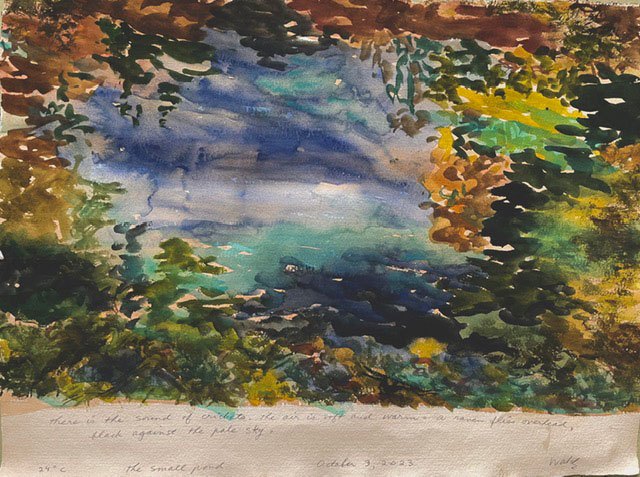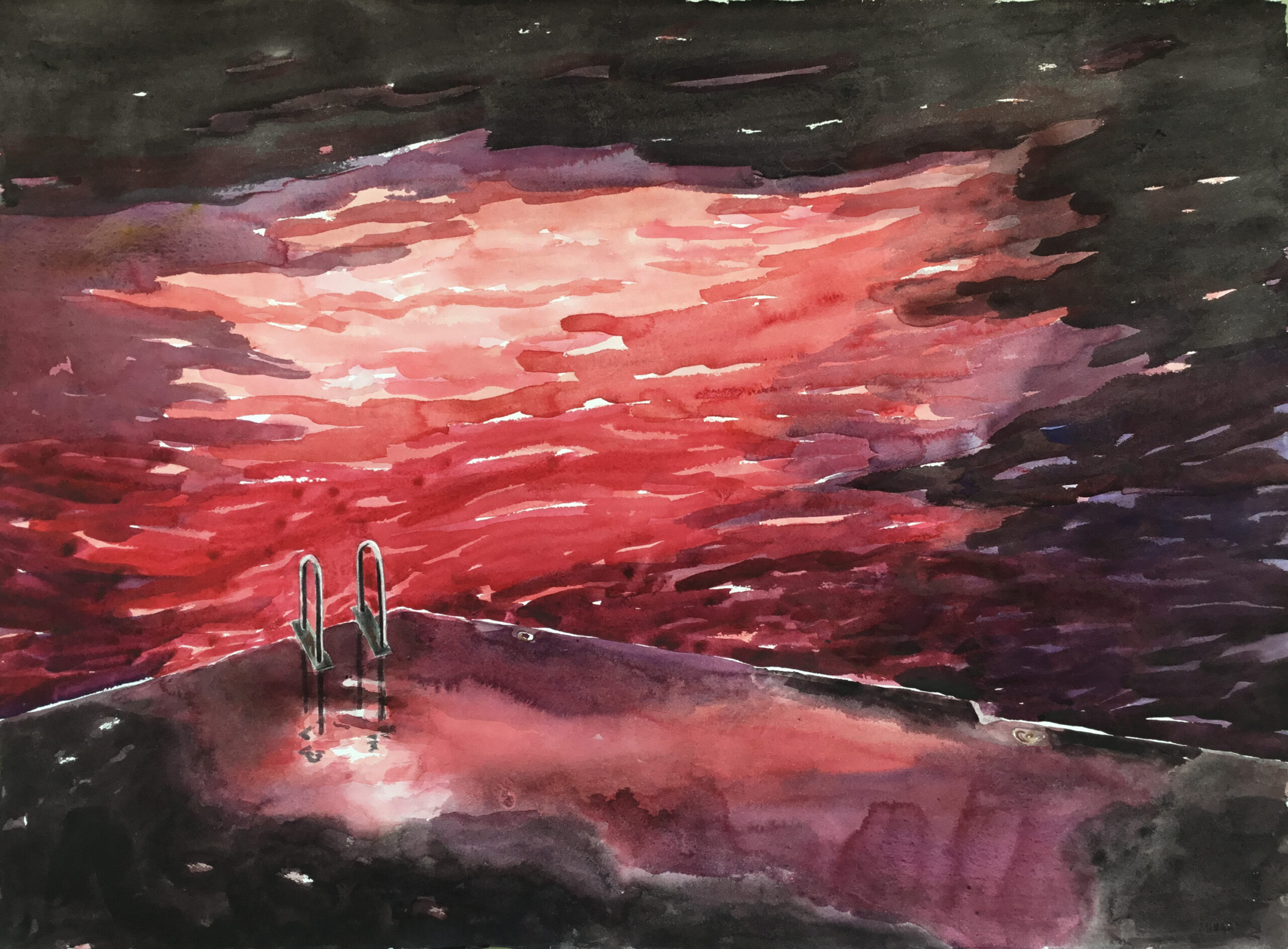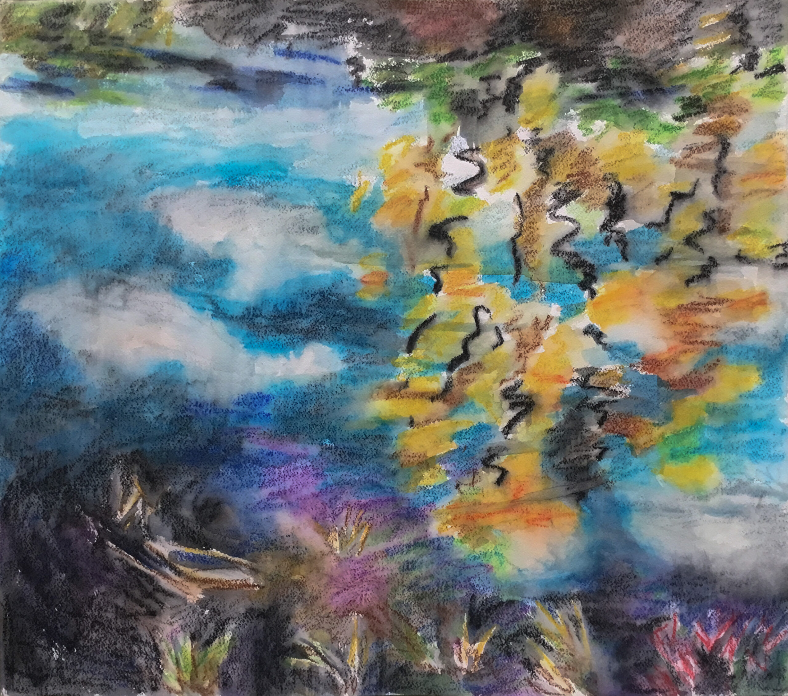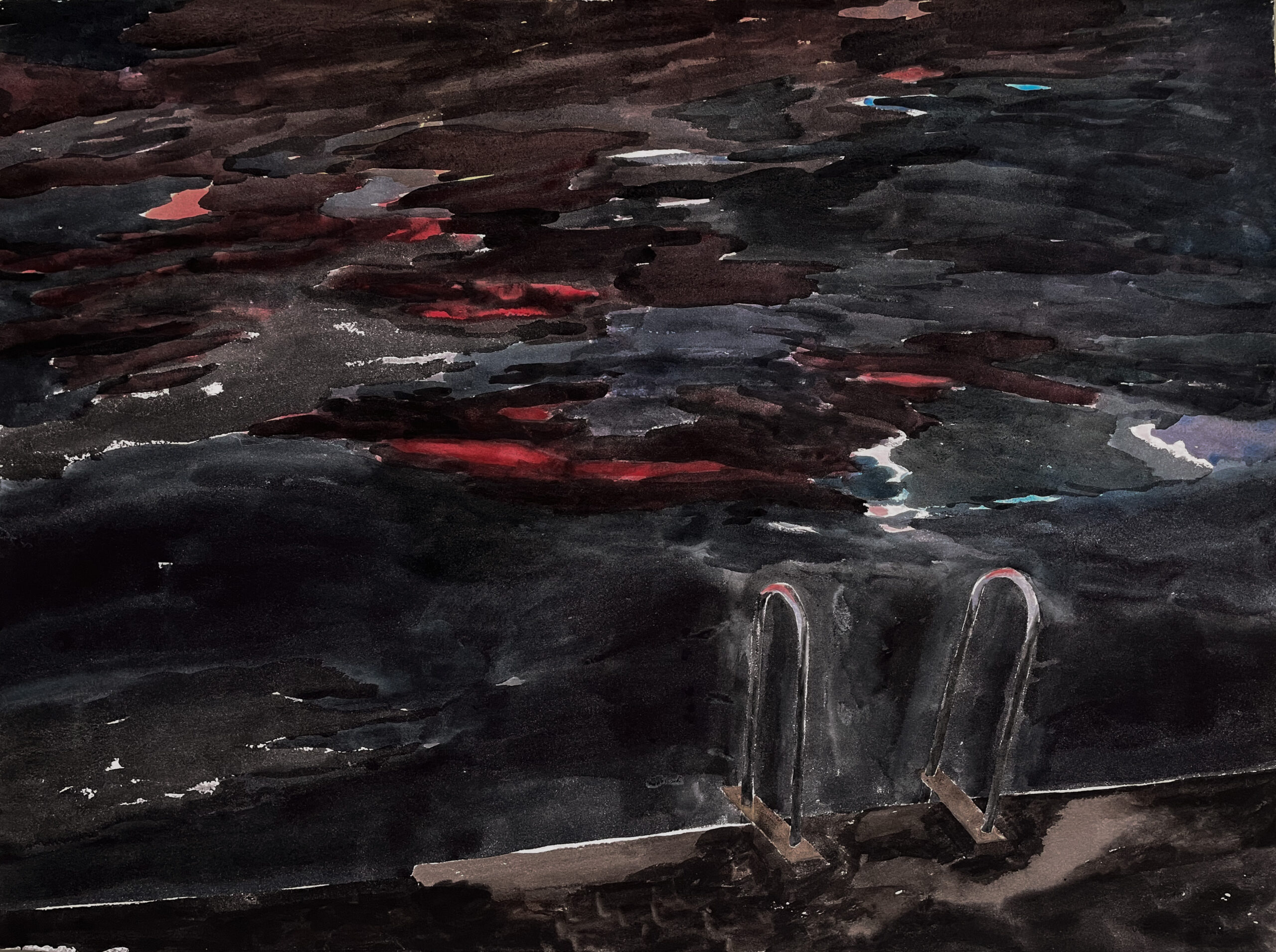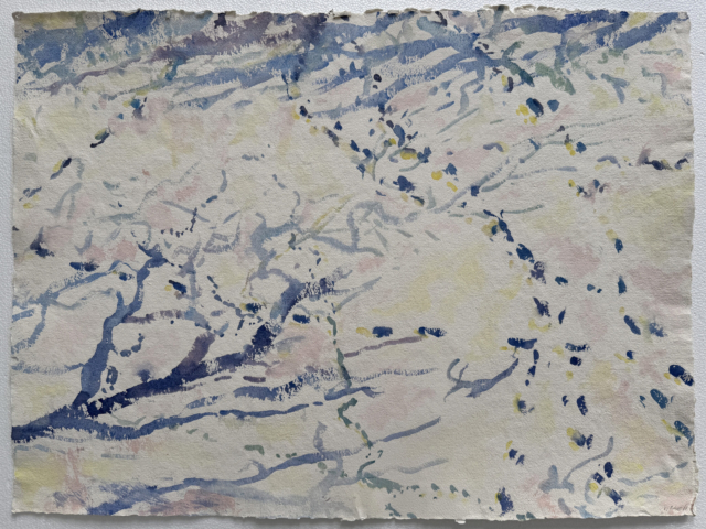 This body of work was done in various locations over a period of several years. The challenge of working on-site helps stimulate both a connection with the subject and an awareness of its energy and vibrancy. In each painting I attempt to transmit a feeling of the primal forces at work within the essential element of water. Water has the power to both nourish and destroy; to change or demolish a landscape. As the 5th century BCE Taoist philosopher Lao Tzu wrote, ‘‘What is softer, more fluid, than water? But water will wear away rock, which is rigid and cannot yield…what is soft is strong.’’ Water is affected by many forces, including the season, weather conditions, temperature, and time of day. It is constantly shifting and changing. Therefore every stroke of watercolour is capturing only one particular moment, and changes in humidity, light level, time of day, etc. will change what is happening with the subject. Each colour, shape, movement, reflection or ripple is only visible for an instant. The painting then becomes a record of a constantly shifting reality rather than a snapshot of a fixed time and place. Moreover, because of its mutable and transient nature, the subject of water can itself become a canvas upon which the artist can transmit emotional, psychological or philosophical states. Water then becomes a metaphor for the fragile nature of our existence.