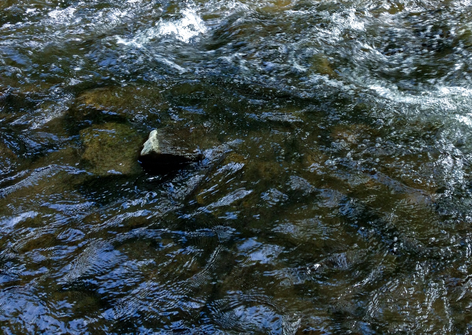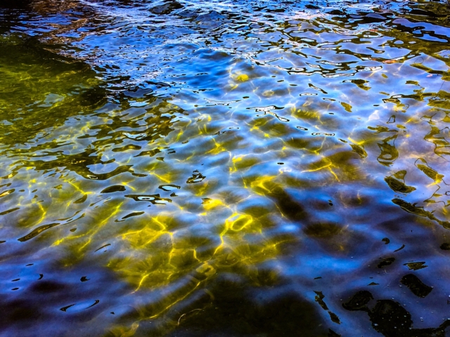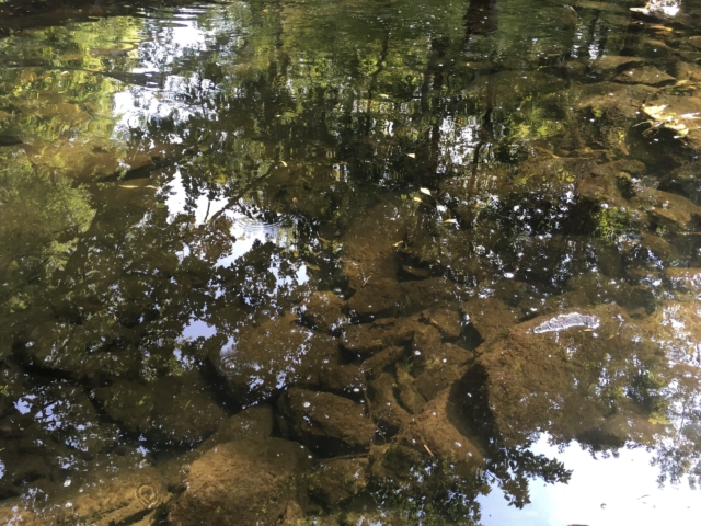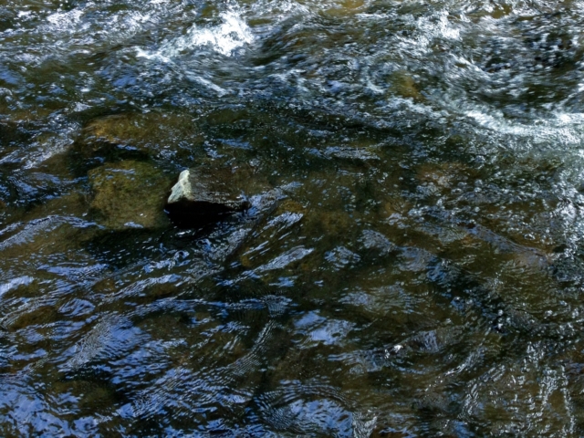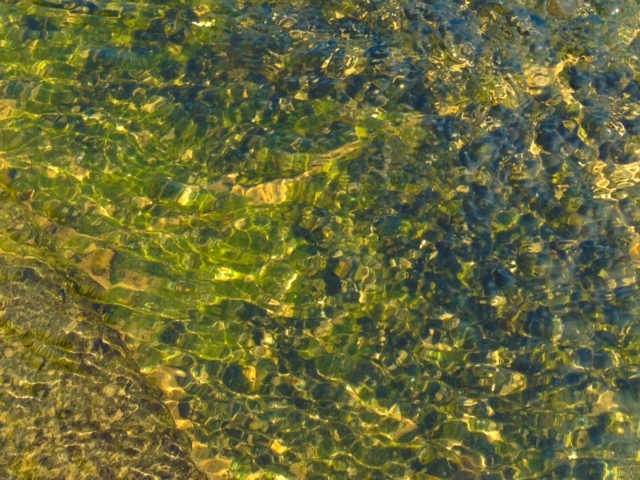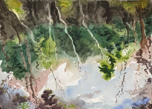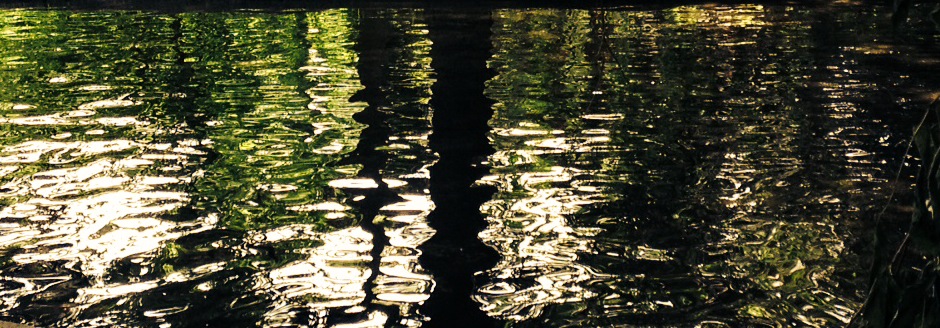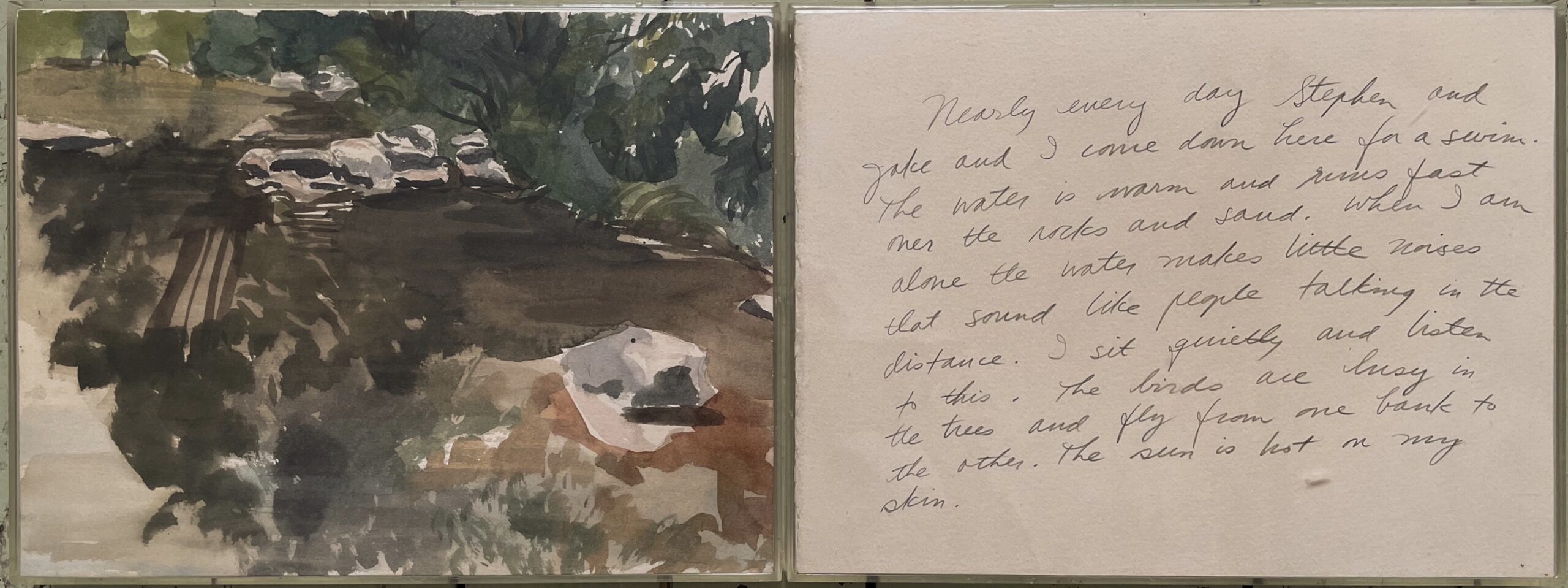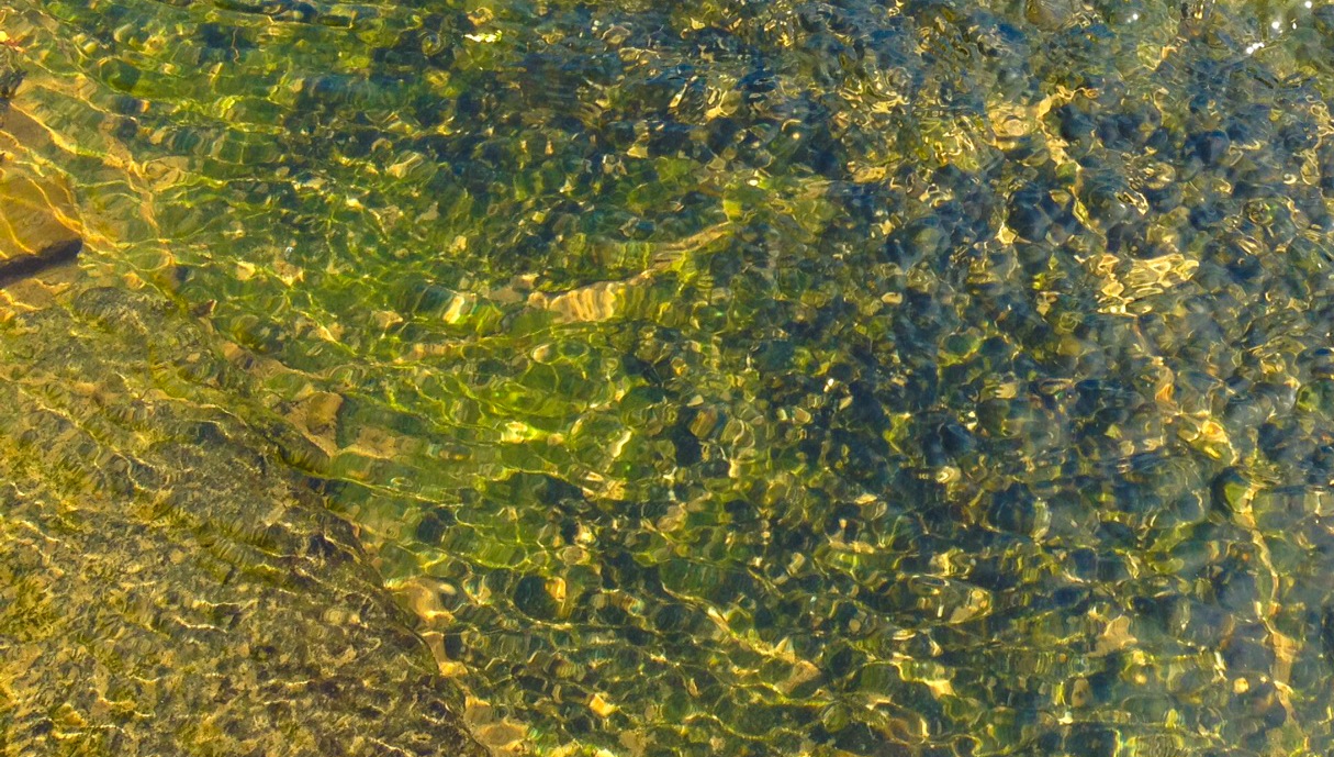 over the rocks and sand. When I am alone the water makes little noises that sound like people talking in the distance. I sit quietly and listen to this. The birds are busy in the trees and fly from one bank to the other. The sun is hot on my skin.