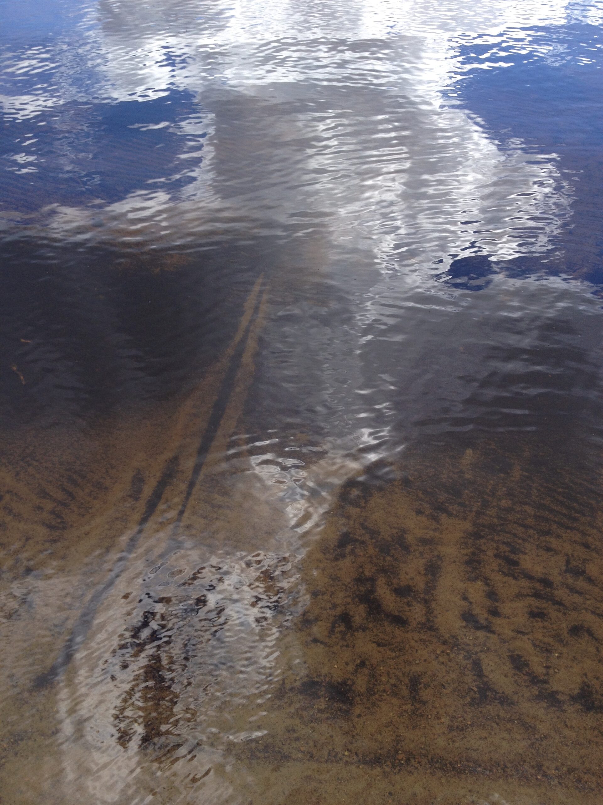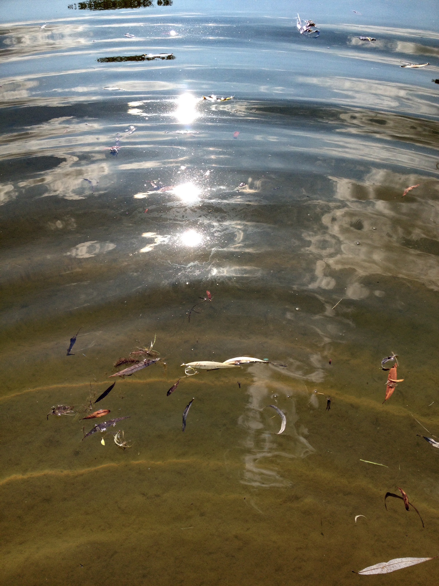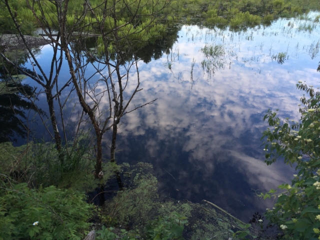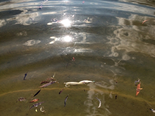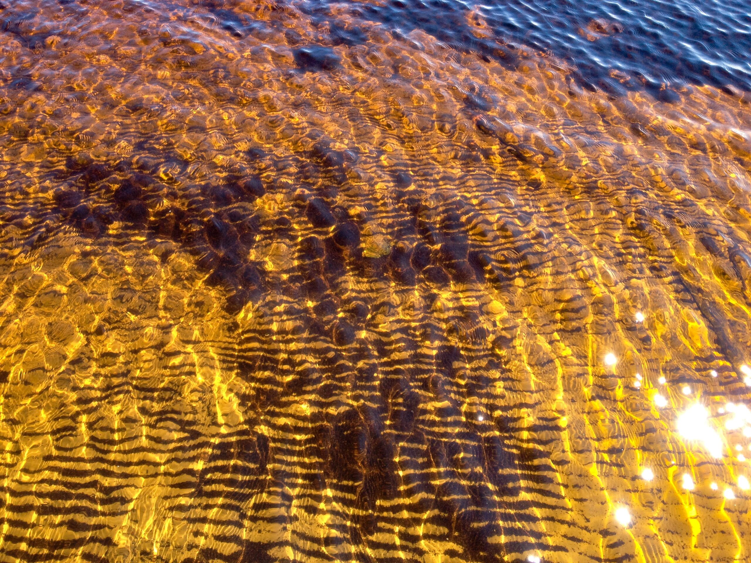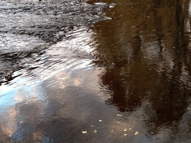 over the rocks and sand. When I am alone the water makes little noises that sound like people talking in the distance. I sit quietly and listen to this. The birds are busy in the trees and fly from one bank to the other. The sun is hot on my skin.