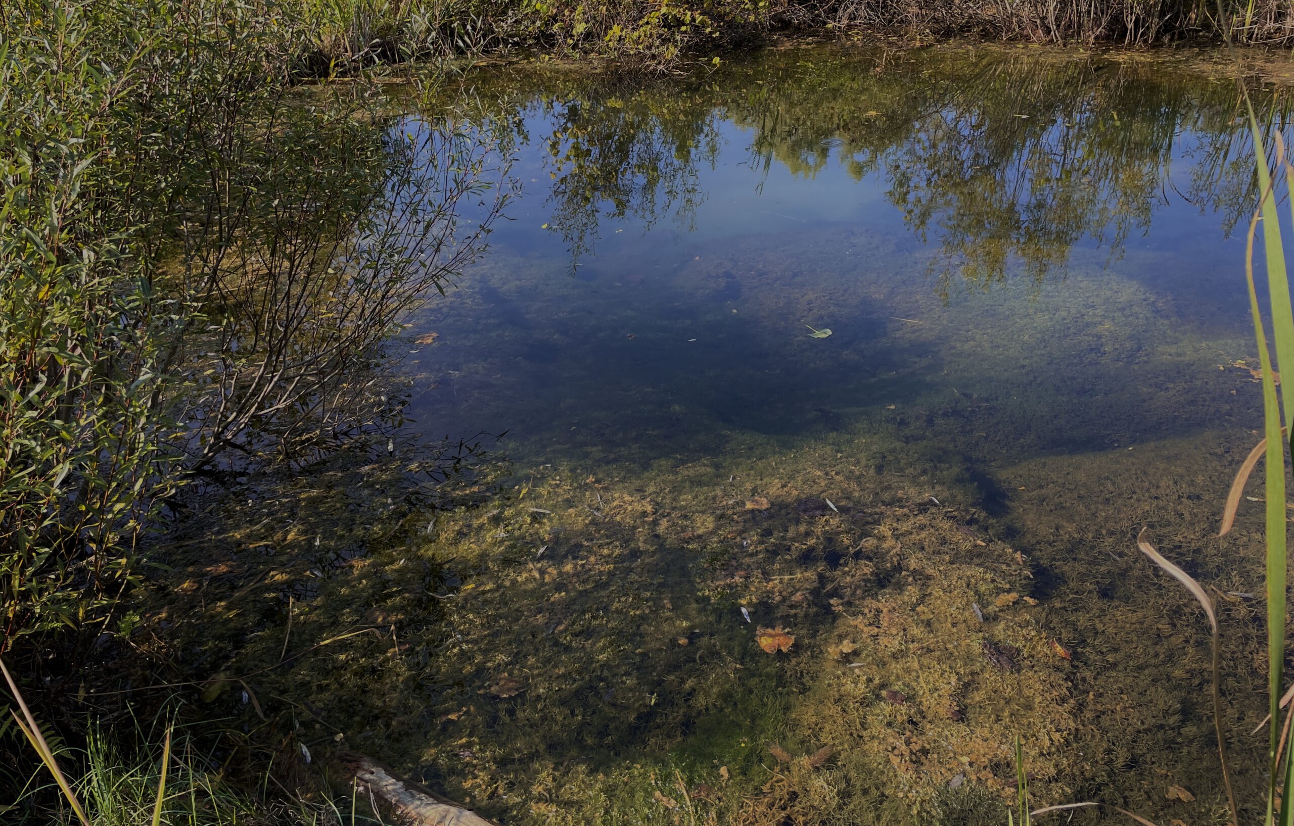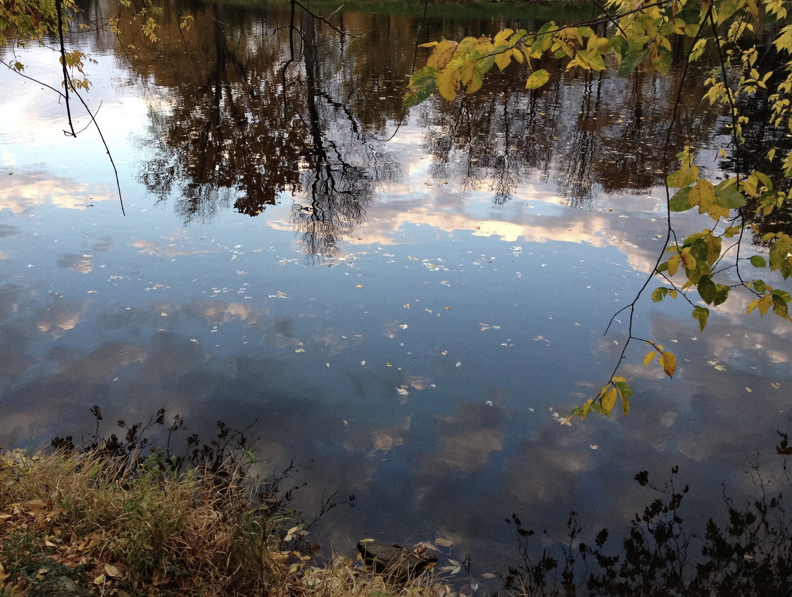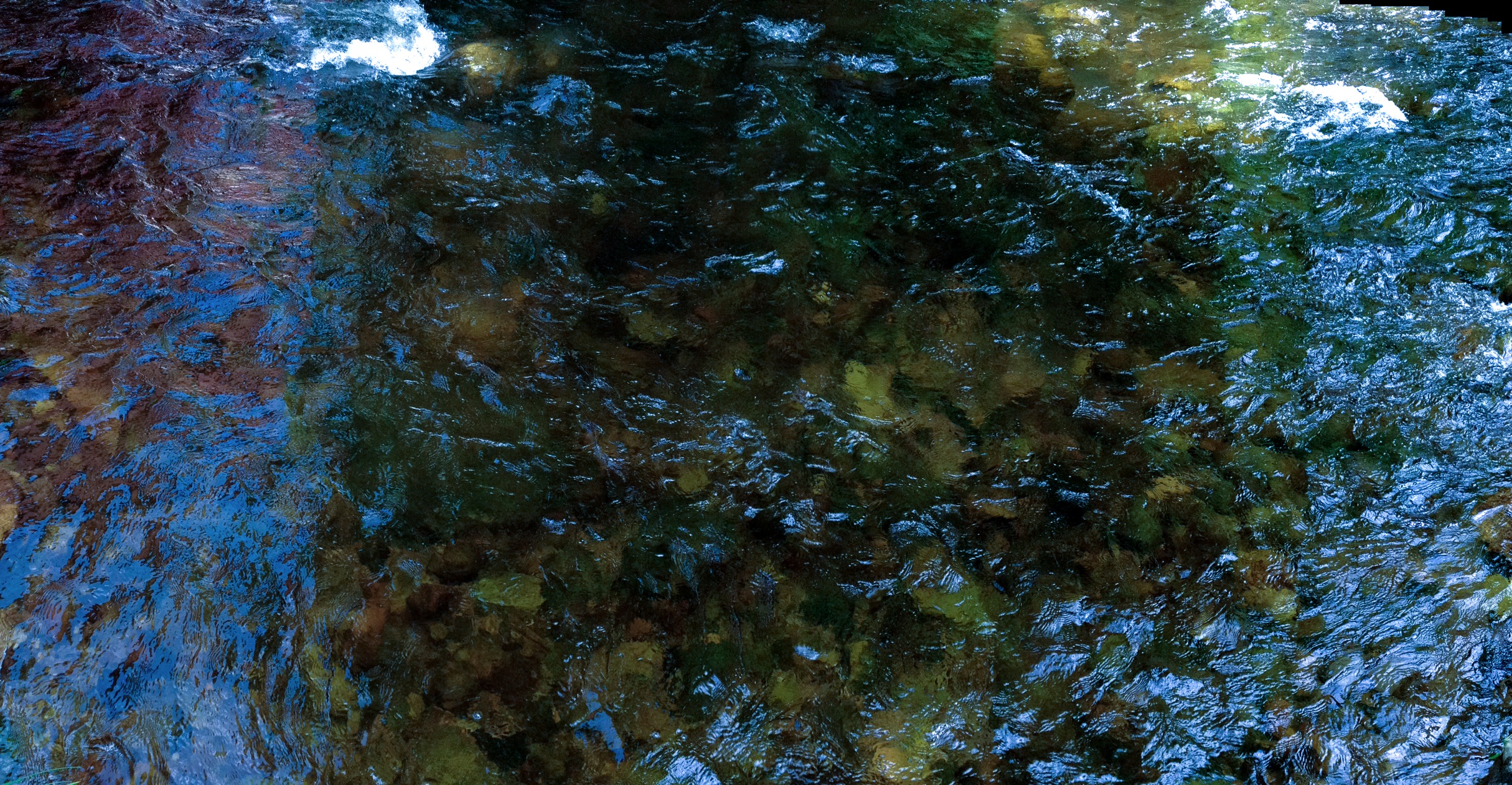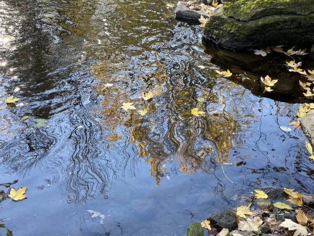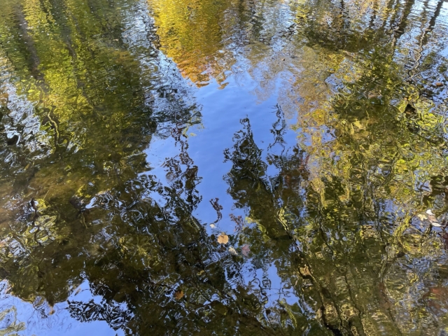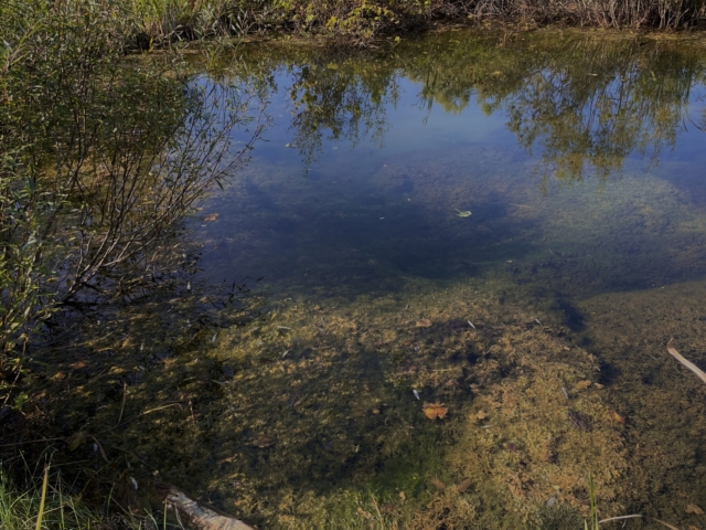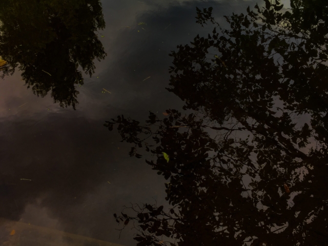 over the rocks and sand. When I am alone the water makes little noises that sound like people talking in the distance. I sit quietly and listen to this. The birds are busy in the trees and fly from one bank to the other. The sun is hot on my skin.